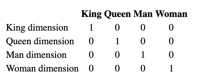 As humans, we can easily discern that there is some connection between these words. “King” and “Queen” are both royal terms. “Man” and “Woman” are gender terms. But there is also a relationship between these pairs of terms. A “King” is traditionally associated with the word “Man” and a “Queen” is often associated with the word “Woman." Our one-hot encoding captures none of this relationship, however.