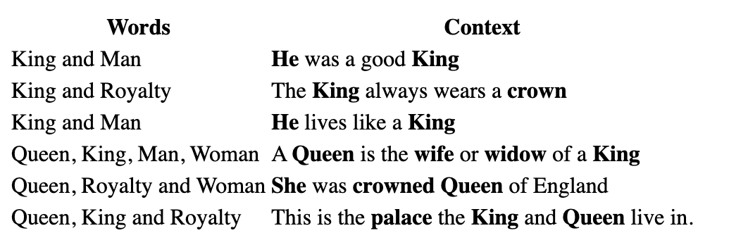 We can see from the table that the words “King”, “Queen”, “Man” and “Woman” are related since they often appear in the same sentences. While we might not explicitly use “Man” or “Woman” we get the context with words like “he” or “she” or “wife” and “husband”. All of this context provides clues as to how each word is related to each other.