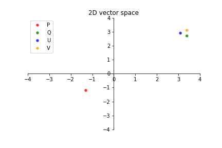 Visualizing embeddings in a vector space helps us identify related entities. Let me explain. Let's assume that the vectors on the graph: P, Q, U and V each represent different sentence embeddings. We can easily see that Q, U and V are closely clustered together, whereas P is in an entirely different quadrant.