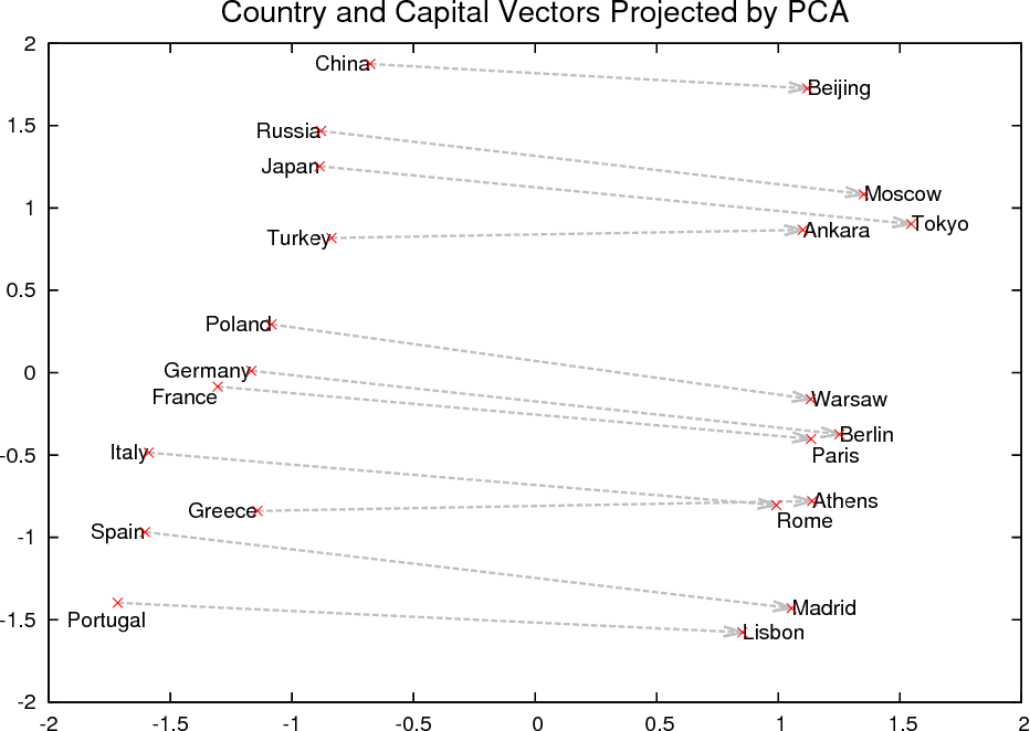 From the graph, we can see that all of the countries are clustered on the left while cities are on the right. So there seems to be a correlation between the words representing countries and, separately, a correlation between the words representing cities. But we also see that there is a correlation between each country and its capital city via a horizontal transformation, i.e. if we traverse the graph horizontally via the arrows we end up close to that country’s capital city and vice versa.